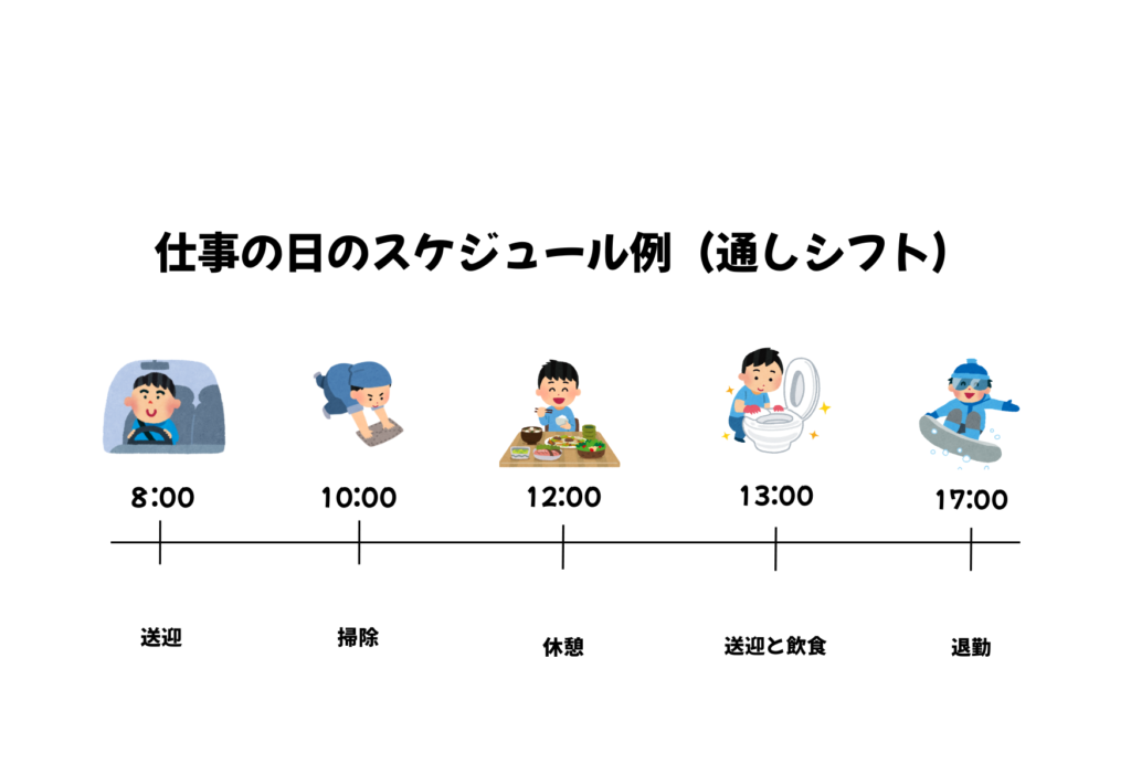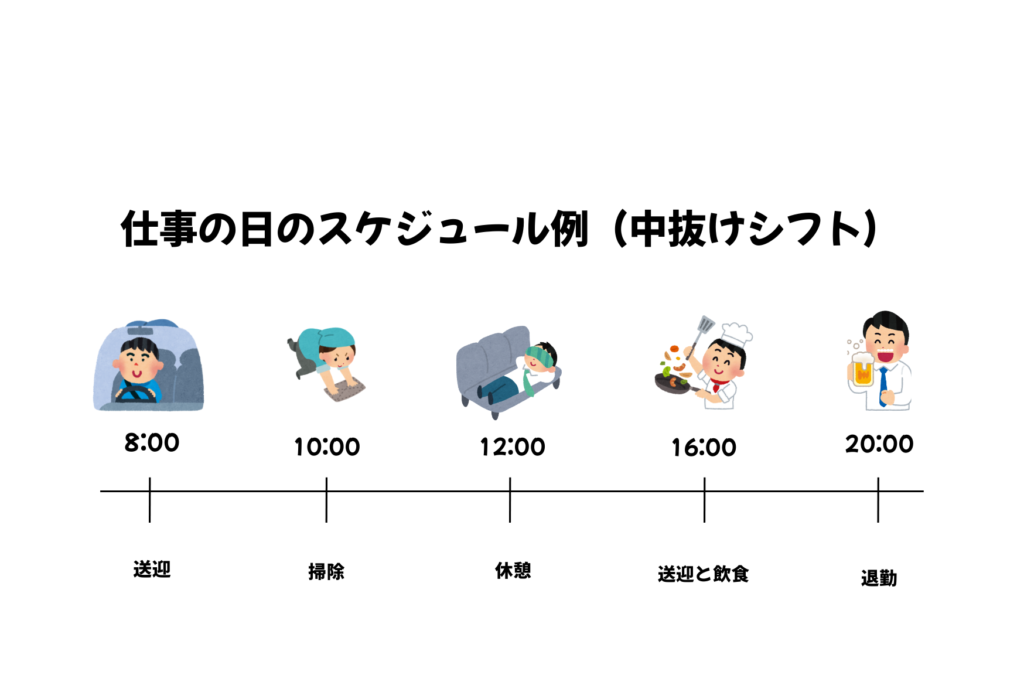 - 夕方以降に送迎がある日は、中抜け後に再度送迎